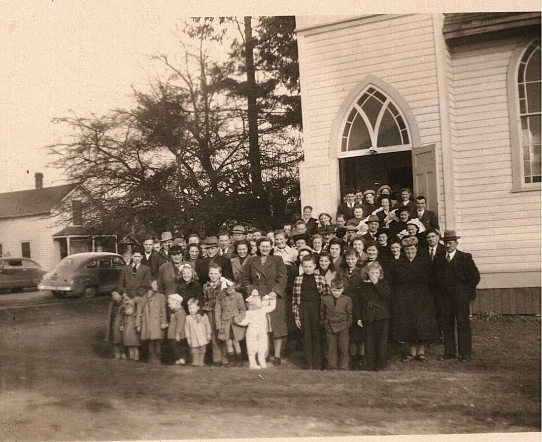 Ladner Christian Reformed Church congregation, at the former Baptist Church building, now the Delta Optimist office, c. 1950.